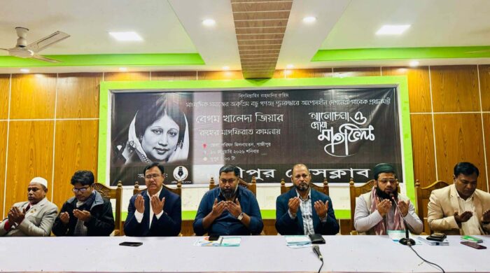 শ্রীপুর গাজীপুর প্রতিনিধি: সাবেক প্রধানমন্ত্রী ও বিএনপি চেয়ারপারসন বেগম খালেদা জিয়ার রূহের মাগফিরাত কামনায় গাজীপুরের শ্রীপুর পৌর এলাকার সরকার বাড়িতে মিলাদ ও দোয়া মাহফিল অনুষ্ঠিত হয়েছে। শনিবার (০৩ জানুয়ারি) সকাল